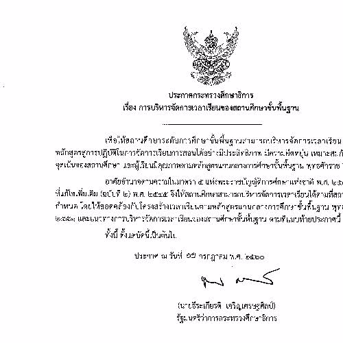 "ประกาศกระทรวงศึกษาธิการ เรื่อง การบริหารจัดการเวลาเรียนของสถานศึกษาขั้นพื้นฐาน".