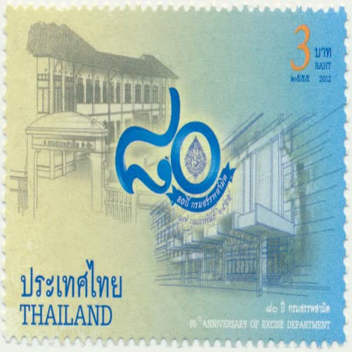 แสตมป์ ๘๐ ปี กรมสรรพสามิต ได้รับใบอนุญาตภายใต้ ให้เผยแพร่-โดยต้องระบุที่มาแต่ห้ามดัดแปลงและห้ามใช้เพื่อการค้า 3.0 Thailand.