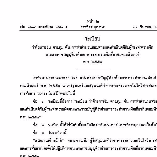 | ชื่อเรื่อง : ระเบียบว่าด้วยการจับ ควบคุม ค้น การทำสำนวนสอบสวนและดำเนินคดีกับผู้กระทำความผิดตามพระราชบัญญัติว่าด้วยการกระทำความผิดเกี่ยวกับคอมพิวเตอร์ |