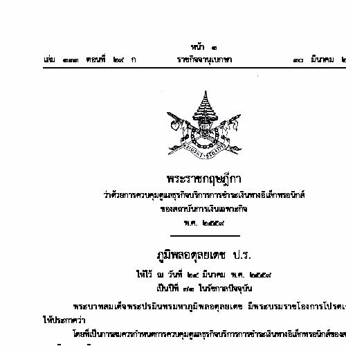 "พระราชกฤษฎีกาว่าด้วยการควบคุมดูแลธุรกิจบริการการชำระเงินทางอิเล็กทรอนิกส์ของสถาบันการเงินเฉพาะกิจ พ.ศ. 2559".