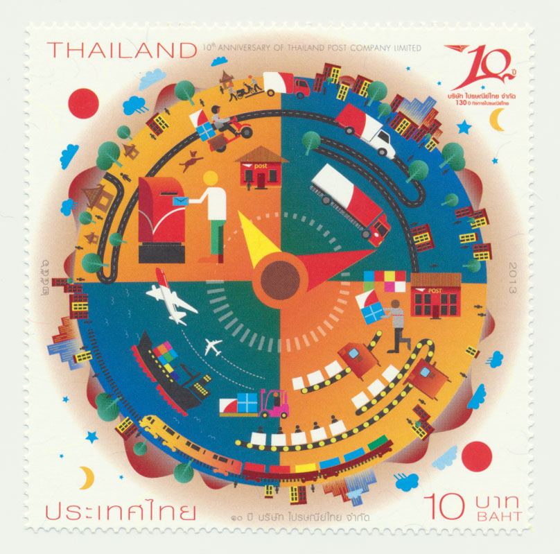 | คำอธิบาย : แสตมป์ ๑๐ ปี บริษัท ไปรษณีย์ไทย จำกัด ๑๔ สิงหาคม ๒๕๕๖ |