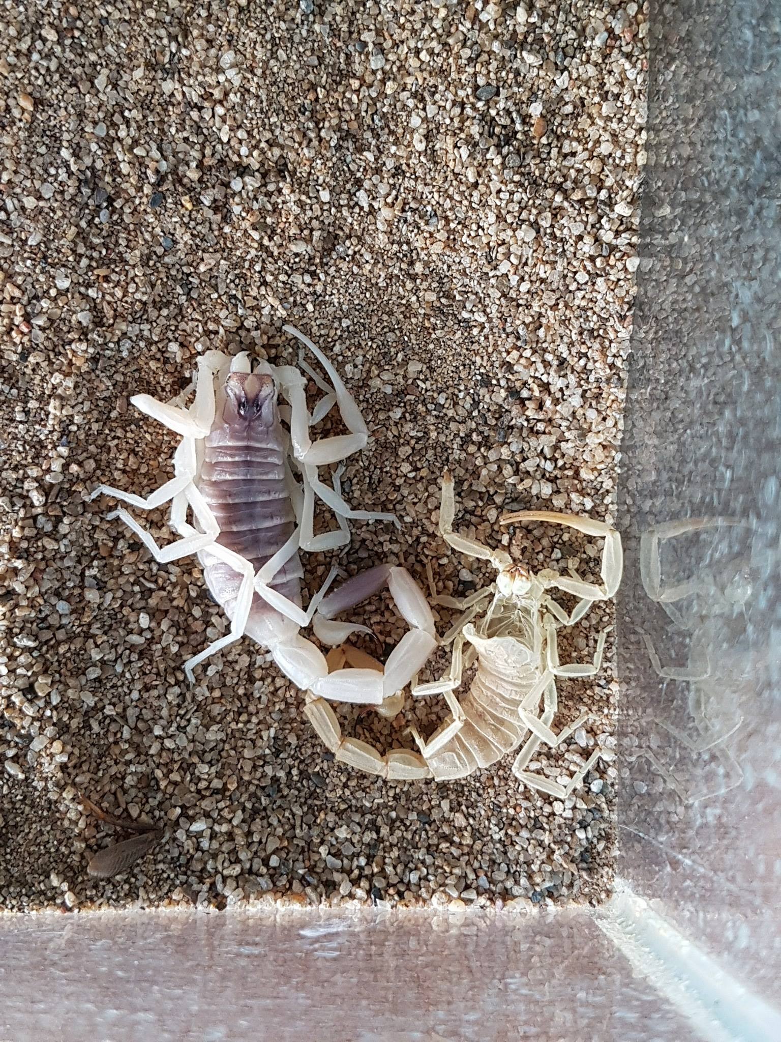 | คำอธิบาย : ปกติแล้วจะมีร่างกายสีเหลืองเหมือนกับเม็ดทรายแห้งๆ แต่ทว่าตัวนี้มีร่างกายออกเป็นสีขาว ผิวยังมีลักษณะอ่อนนุ่มเพราะเพิ่งจะพ้นจากช่วงเวลาลอกคราบมาได้ไม่นาน จากนักล่าผู้เหี้ยมโหดจะกลายเป็นผู้ถูกล่าได้ในช่วงเวลานี้ จึงนับเป็นช่วงเวลาที่อันตรายที่สุดช่วงหนึ่งของเหล่าแมงป่องเลยทีเดียว |