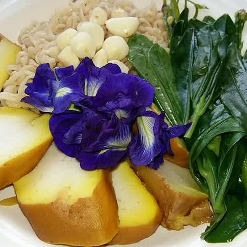| คำอธิบาย : บะหมี่แห้งลวกเต้าหู้และผักกับดอกอัญชัน |